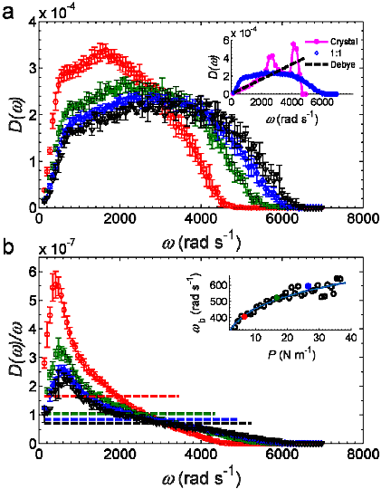玻色峰,是指在无序体系中低频区域相对于德拜模型有过剩的态,具体可以表现为在态密度曲线的某个特征频率以及比热容曲线的特定温度上有个峰, 或者在热传导曲线对应温度有个平台。虽然玻色峰被理论,模拟以及实验进行过广泛的研究,但它的本质目前还是备受争议。 在这项研究中,论文作者通过二维光弹性颗粒体系,通过光弹性技术对玻色峰的本质进行了深入的探索,尽管该体系是个相对简单的模型系统,但通过对比,他们发现在这种二维宏观颗粒体系所得到的玻色峰形状与三维分子玻璃等材料惊奇的相似。 而对于玻色峰产生的微观机制,他们认为是与剪切模量在空间中的不均匀性息息相关的,具体表现在:(1) 在玻色峰频率附近,横波的色散关系曲线发生强烈的色散,而纵波基本上是线性的;(2) 横波的相速度在玻色峰附近表现出一个最小值,符合之前的理论预测;(3) 从剪切模量的空间不均匀性中所获得的特征长度与玻色峰对应的波长在量上是相互对应的;(4) 非仿射的剪切模量与低频模式存在很强的空间关联,进一步表明非仿射剪切模量对玻色峰形成的重要性。