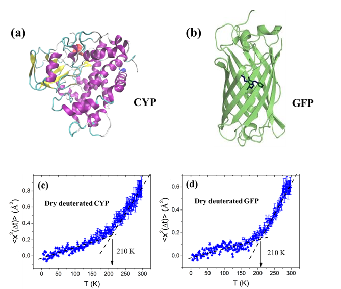 图1: (a) 细胞色素蛋白(CYP) 结构示意图,(b) 绿色荧光蛋白(GFP) 结构示意图;中子散射测试得到的不同温度下冻干蛋白质重原子(C, N, O)在纳秒时间内的均方位移<x2(Δt)>: (c) 全氘化细胞色素蛋白(D-CYP)和 (d) 全氘化绿色荧光蛋白(D-GFP)。