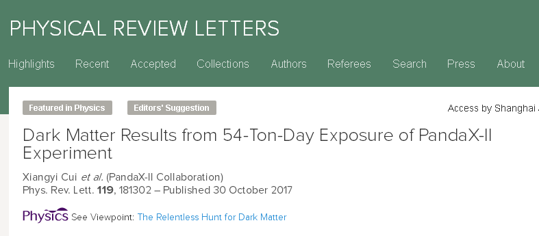 Bevictor韦德季向东和刘江来教授领导的PandaX-II合作组最新的暗物质探测结果于2017年10月30日以“编辑推荐”文章在《物理评论快报》发表【Phys. Rev. Lett. 119, 181302】。该结果由季向东于今年8月8日在国际粒子天体物理大会上公布,8月24日投稿,9月20日被《快报》正式接受。基于目前世界上公开报道的最大的暗物质探测曝光量(54吨·天),PandaX-II给出的最低暗物质与质子、中子的自旋无关相互作用截面上限为8.6×10-47cm2(对应暗物质质量为40GeV/c2),并在暗物质质量大于100GeV/c2的大质量区间给出了目前国际上最强的测量限制,以高置信度排除了暗物质粒子与普通物质通过传递标准模型粒子相互作用的可能性。该结果比PandaX-II于2016年发表的当年最好结果的探测灵敏度提高了三倍。PandaX-II的国际竞争对手、意大利的XENON1T实验的首个结果(今年5月公布)也被发表在同一期的《物理评论快报》上。费米实验室的理论天体物理部主任DanHooper教授为PandaX-II和XENON1T的最新文章写作了“观点”(Viewpoint)评论,是该期刊最高规格的评论系列。