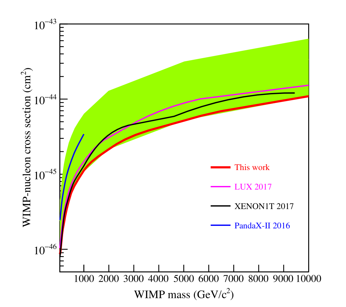 PandaX-II团队在2017年初对探测器进行了升级工作,将实验中的放射性本底降低至原来的三分之一。为了改善探测器性能,团队里多位研究人员长期在地下实验室工作,春节等节假日也没有休息。PandaX-II本期数据采集自2017年4月22日开始,至2017年7月15日结束,获得了77.1天的数据。加上首期获取的79.6天数据,PandaX-II总共的暗物质探测数据曝光量达到54吨·天,是目前世界上报道的最大的暗物质探测数据曝光量。这一阶段数据采集结束后,团队里多位研究工作者夜以继日完成了数据分析工作,在分析方法上采用了多项改进,利用多种刻度数据对探测器响应开展了细致的研究。最终筛选出177个低能散射事例,但没有一个符合暗物质散射的甄别条件,因此得到了暗物质和质子中子相互作用的最新上限(见附图红线)。