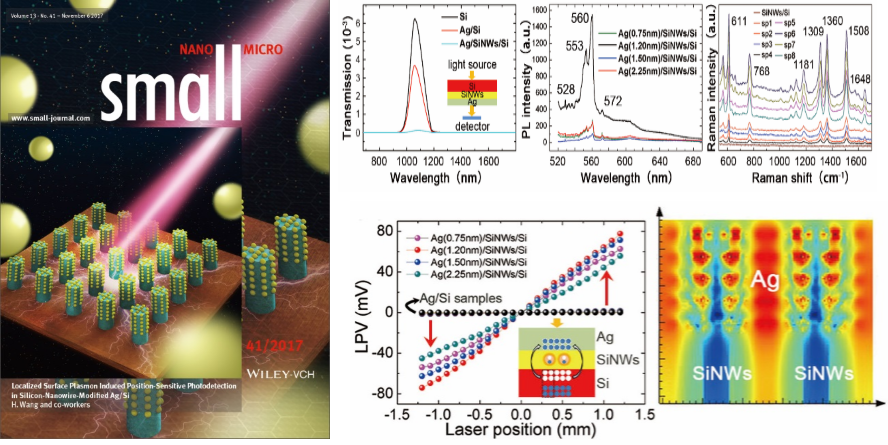 近日,德国Small【Small 13, 1701726 (1-8), IF:8.643】以封面论文(back cover)形式报道了Bevictor韦德光科学与工程研究中心王辉教授课题组提出的硅纳米线修饰的纳米银颗粒/硅结构中局域表面等离子体激发的高性能位置灵敏光电探测器研究成果:Localized Surface Plasmon Induced Position-Sensitive Photodetection in Silicon-Nanowire-Modified Ag/Si,该论文的第一作者为王辉教授指导的博士生梅春练。