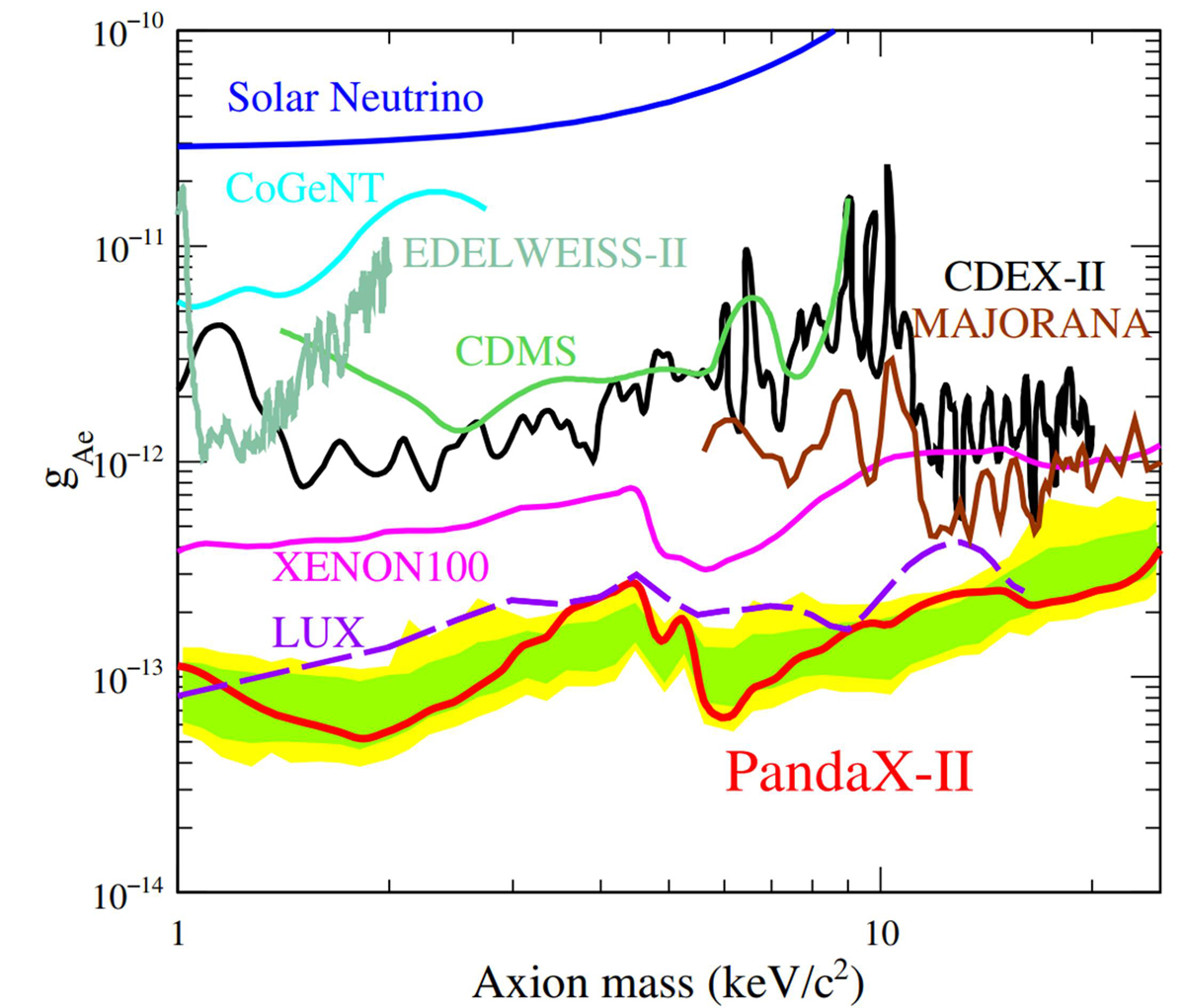 PandaX-II是目前世界上正在运行的最大的地下暗物质探测实验之一,实验采用高纯氙为探测介质,在千电子伏特能区的稀有事例的探测上具有极高的灵敏度。在这次的数据分析当中,PandaX-II采用了大约80天的数据量就获得了国际同类实验中最为领先的结果。该结果将千电子伏能量区域内,来自太阳的轴子与电子间的耦合常数限制在小于4.35×10-12的范围内,而星际类轴子粒子的耦合常数则限制在1×10-13以下。