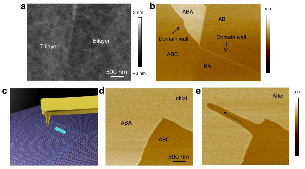 (d)一片包含ABA和ABC两种堆叠区域的三层石墨烯近场光学图片;(e)经过纳米探针操纵,部分ABA堆叠区域转变为ABC堆叠。