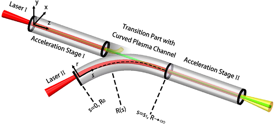 图1.基于渐变曲率半径的弯曲等离子体通道的激光尾场级联新方案。