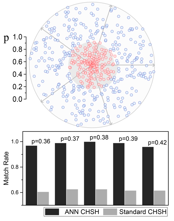 同年,翁文康教授提出一种全新的理论模型[arXiv: 1705.00813(2017)],将量子力学中贝尔不等式测量参数对应到人工智能网络,成功简化了传统上被认为是一项资源消耗度相当高的量子态分类问题,只需少量投影测量即可判定量子态的纠缠性质。
