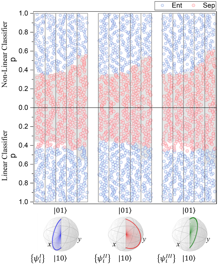 (实验对比线性优化与非线性优化的量子态识别结果,带有隐藏层的神经网络能正确地预测不同类纠缠的动态边界)