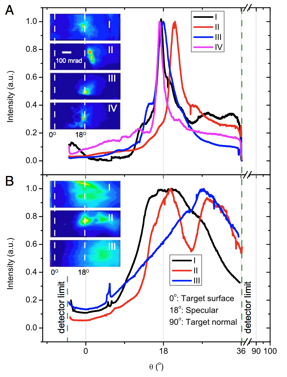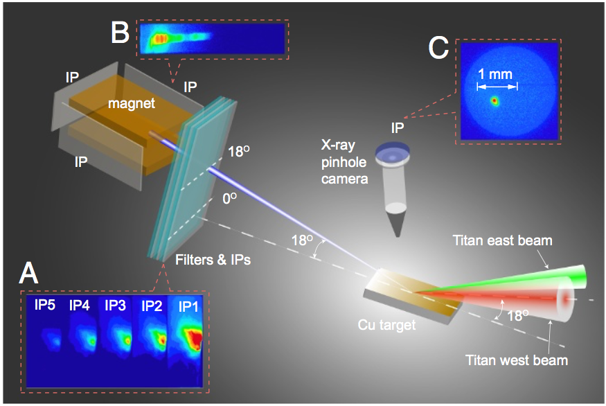 该团队利用美国劳伦斯利弗莫尔国家实验室的Titan激光器(峰值功率200TW,脉宽1ps)与固体铜靶相互作用(图1),产生了电荷量~100纳库,发散角小于3度(图2),具有准单能能谱结构的相对论电子束。电子束的品质可以通过调节激光脉冲的对比度和能量来加以控制。通过理论分析和数值模拟揭示了一种新型加速机制:首先通过激光预脉冲在固体表面产生近临界密度的预等离子体,并在其中形成低密度等离子体通道;捕获在等离子体通道内的电子被通道中极高的横向电磁场所箍缩,从而形成具有高度准直和极高电荷量的电子束。不同于一般激光尾场等离子体波加速,该电子束的能量主要来源于加速梯度更高的激光电场直接加速。等离子体通道的作用则是持续提供电子源、导引激光脉冲并对电子束进行箍缩,这样就形成了完整的加速结构。