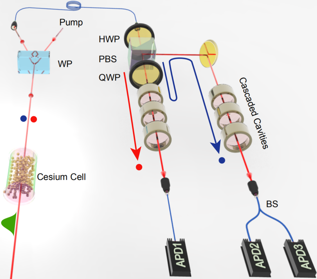 如果产生非经典态所使用的物理系统以及作用机制都能与量子存储器的一致,那么这样的非经典态的频率和带宽将会和量子存储器的完美匹配,一个简洁的量子信息网络就可以直接实现。在过去的十五年中,许多基于冷原子的工作成功产生了非经典态(预报式的单光子源或者叫双光子源)。但是具备室温、宽带特性的量子比特光源更具吸引力,而且也是具备信息处理速度快且物理上可扩展的量子技术所必需的。很多研究团队尝试过在室温环境下得到这样的量子比特光源,单发现噪音太大,不能工作在量子区域下。之前的实验往往采用的失谐比较小,因此受到多普勒效应和原子碰撞导致的荧光噪音的严重影响。值得一提的是宽带非经典关联可以使用连续激光激发具有梯形能级结构的热原子来产生。但是这样的光子的产生时间是随机的,明显不同于宽带量子存储器的运行方式(读写是脉冲式的和可编程的)。