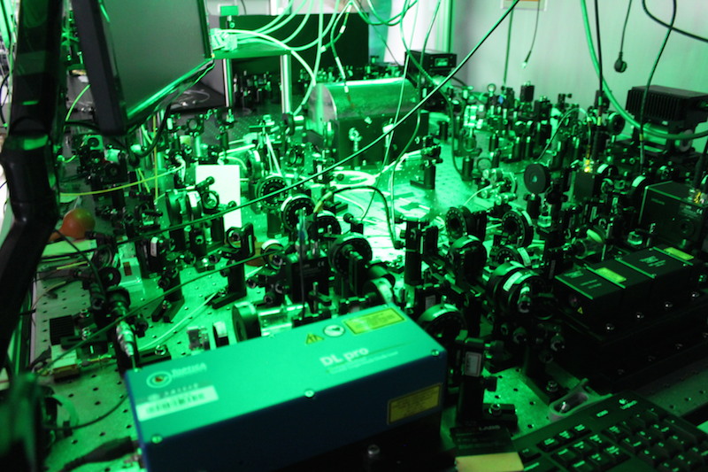 (左图:简化的实验装置图。红色圆点和蓝色圆点表示非经典关联的光子对。右图:实验装置)