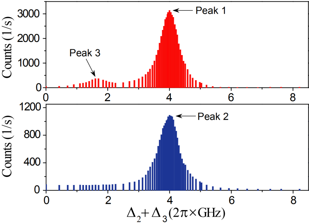 (滤波腔的透过窗口和光子频谱的卷积。峰1和峰2对应的光子就是我们想要的非经典关联光子对。)