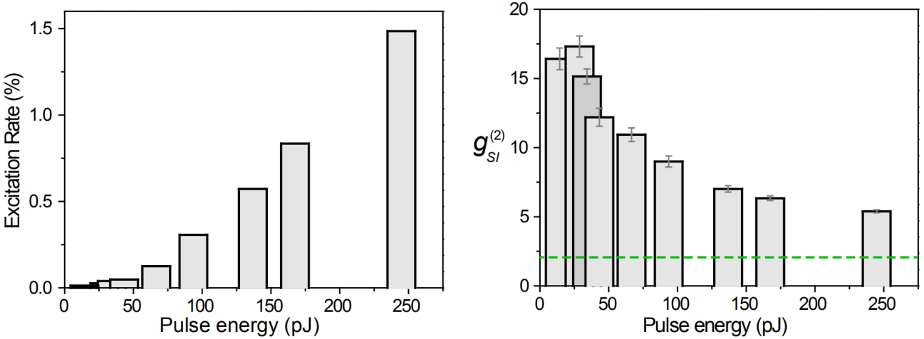 (左图为关联光子对的激发概率与脉冲能量的对应关系。右图所示的互关联函数都超过经典边界2,即绿色虚线。这说明观测到的光子对是非经典关联的。)