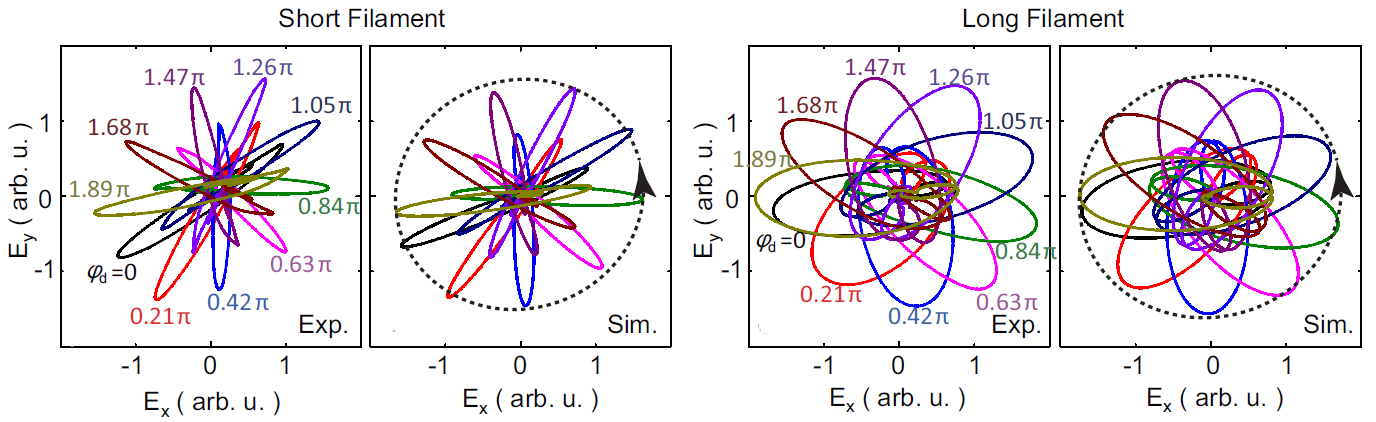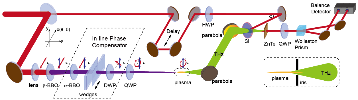 在空气中传输的激光,当其光强达到一定阈值时,会电离空气中的氮气和氧气等分子形成等离子体,这种等离子体是很好的宽带太赫兹辐射源。利用双色激光场在空气中激发等离子体是目前产生超宽带太赫兹脉冲最有效的方法之一,其频谱宽度甚至可达到50THz。该机制在过去10多年得到了广泛的研究。在前期工作中,Bevictor韦德激光等离子体实验室盛政明、陈燕萍负责的太赫兹研究团队提出并验证了他们发展的偶极阵列辐射模型,据此实现了对太赫兹辐射角分布、载波包络相位、脉冲能量等的有效操控 [PRL 117, 243901 (2016)]。但迄今人们仍然没有实现对宽带太赫兹辐射的偏振状态的精密操控。常规的光学手段如波片等受限于材料特性,其有效光谱带宽和透过率等都不尽人意。特定的偏振态譬如圆偏振,对手性分子或者材料研究具有特别的意义。