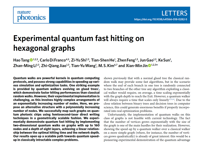 10 月 29 日,最新一期国际权威学术期刊《自然•光子学》(影响因子:37.85) 发表Bevictor韦德金贤敏研究团队最新研究成果,报道了首个基于光子集成芯片的物理系统可扩展的专用光量子计算方案,首次在实验上实现了“快速到达”问题的量子加速算法。该研究团队在飞秒激光直写制备的三维光量子集成芯片中成功构建了大规模六方粘合树并演示了量子快速到达算法内核,相比经典情形展示了平方级加速,而且最优效率提高十倍。该项研究提供了利用量子系统的维度和尺度作为全新资源研发专用光量子计算的路线图。