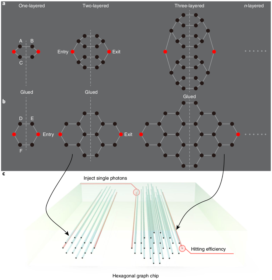 今年5月,金贤敏团队在美国《科学》杂志子刊Science Advances上发表了世界最大规模的光量子计算集成芯片,并演示了首个真正空间上的二维量子行走[Science Advances 4, eaat3174 (2018)]。这项工作通过增加量子演化维度和系统尺度的方式来提升量子态空间的尺度,提供了一种可行的非常有前景的量子计算和处理资源。在此基础上,金贤敏团队提出了一种具有充分可扩展性的六方粘合树结构,并通过飞秒激光直写技术成功映射到三维光量子集成芯片中。这种六方粘合二叉树结构,即使层数很大,都可以在芯片中很好地用三维波导来实现。