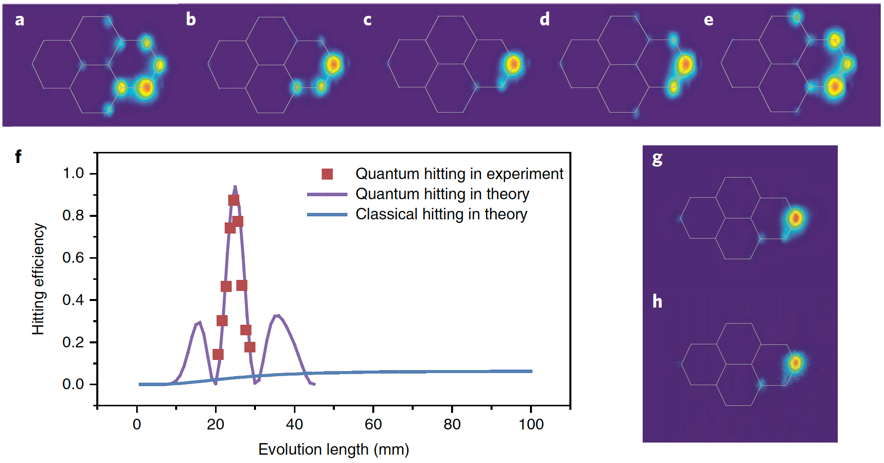 实验中首先根据理论预测的量子动态演化过程中最大的到达概率以及对应的最优演化长度,通过飞秒激光直写技术制备最优演化长度附近的若干组芯片样品。然后通过激光注入、CCD成像观测芯片输出的光强概率分布,确定不同层数结构的最优演化长度。注入单光子量子光源,用高精度单光子成像观测在最优“快速到达”情形下的演化图形。图二展示了量子算法可实现约90%的最优到达效率,最优演化长度约为25mm。而经典算法只能缓慢地达到最优演化情形,且最优到达效率只有6.25%,比量子行走小了十倍。这是经典随机行走的扩散传输本质导致的,出口节点达到的最优到达效率相当于1除以所有节点的数目。量子行走在复杂分叉结构时可以选择左和右的叠加态,从而在最优到达效率和最优演化长度都实现明显的优势。