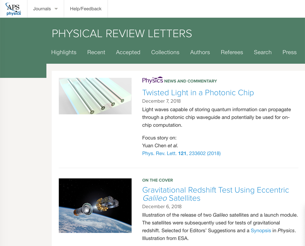 由于此项研究的重要意义,国际物理学权威期刊《物理评论快报》不仅将金贤敏团队的这篇文章遴选为编辑推荐,同时还邀请了过去20年来一直在国际顶级期刊《Nature》做编辑的Philip Ball撰写了 Twisted Light in a Photonic Chip [Physics 11, 125 (2018)]进行深入报道。