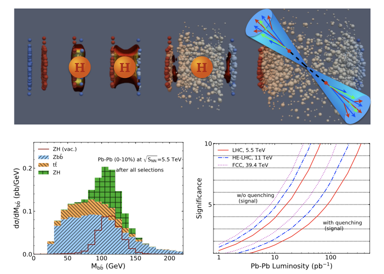 图注:(上)希格斯粒子在相对论性重离子碰撞中产生及强子化衰变过程示意图;(下)希格斯信号及背景的关于末态双喷注不变质量的分布,以及预期在不同对撞机上信号统计显示度随实验亮度的变化。