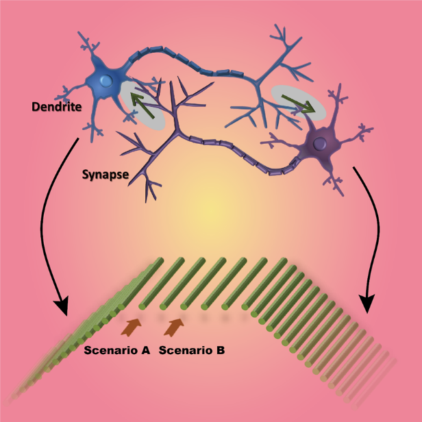 图一:神经元双向传输信号示意图,以及构建量子随机行走实现“联想记忆”的理论在光波导系统中的对应。