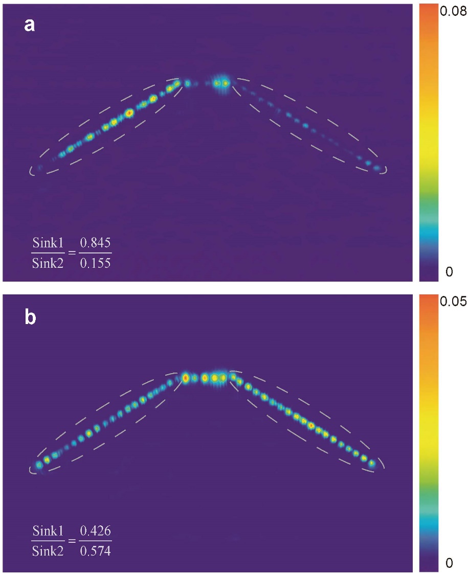 实验中实现距离能量低谷的汉明距离各不相同的不同放电模式,展示了与理论模拟一致的“联想记忆”结果,即放电模式往往选择相距汉明距离最近的能量低谷达到稳态分布。另外,一定程度经典噪声与量子行走的混合能够提升到达能量低谷的传输效率,为“联想记忆”速率带来一定的优化。