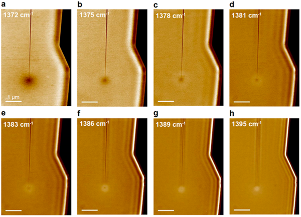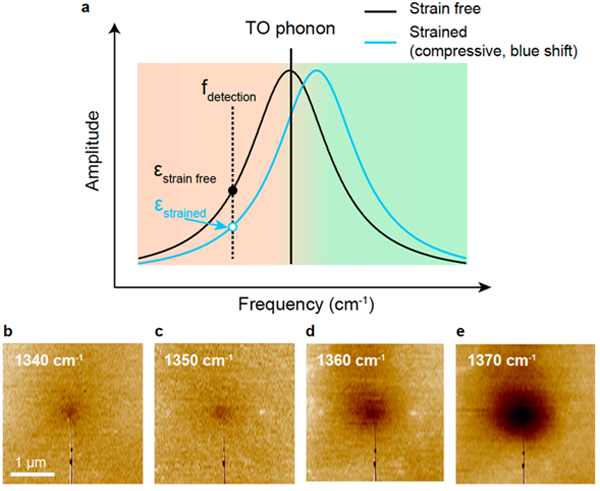 图二:近场红外探测材料声子频率移动基本原理(a)及具体探测实例(b-e)。