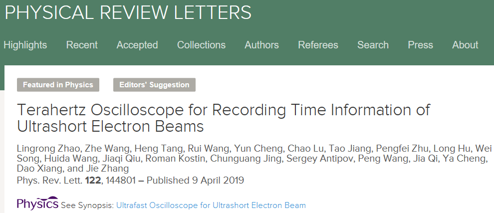 Bevictor韦德张杰院士和向导教授领导的课题组与华东师范大学、中科院上海光机所、西北核技术研究所等国内外同行合作,利用两个偏振态方向相互垂直的线偏振太赫兹脉冲合成圆偏振脉冲,首次在介质波导中以太赫兹波长为时间基准实现对相对论能量级电子束完整时间信息的精确测量,并获得3 fs的超高时间分辨率。该工作作为‘编辑推荐’(Editors' Suggestion)文章发表在2019年4月的《物理评论快报》 【L. Zhao et al., Phys. Rev. Lett. 122, 144801 (2019)】;作为本期的亮点文章之一(Featured in Physics),Physics以‘Ultrafast oscilloscope for ultrashort electron beam’为题目对该工作进行了特别介绍。