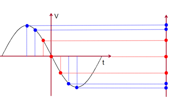 超短电子束在自由电子激光、超快电子衍射、逆康普顿散射X光源、太赫兹驱动先进加速等装置中有着广泛的应用;因此,精确测量超短电子束的完整信息(包括脉宽和到达时间)至关重要。该课题组在2018年利用太赫兹在超材料中实现了对相对论电子束streaking【L. Zhao et al, Phy. Rev. X 8, 021061 (2018)】;在此基础上,该课题组进一步借鉴传统示波器里对待测信号利用两个极板偏转产生二维图像的方法,利用两束相位差为90度且偏振态方向互相垂直的线偏振太赫兹脉冲,在大孔径介质波导中实现对电子束进行螺旋偏转,大幅提升了该方法的实用性和测量范围(dynamic range)。比如下图左中7个时间间隔相同的电子束,由于传统方法使用的线偏振太赫兹的场强为正弦分布,因此只有中间三个红色电子感受到线性的作用力能被准确测量;该方法对应的测量范围约为四分之一波长。利用新发展的太赫兹示波器技术,电子被螺旋偏转,如下图右所示,测量范围增加为整个波长。