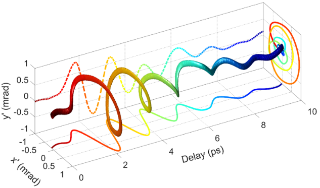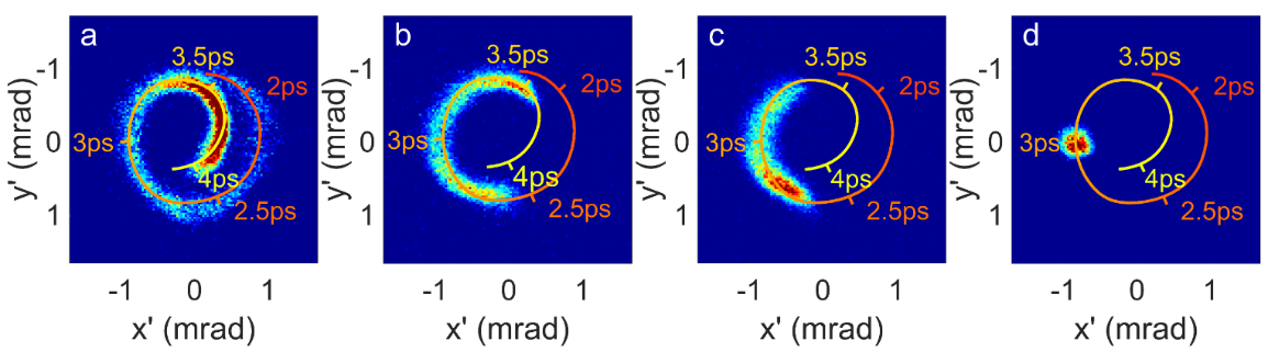该课题组进一步对THz脉冲的包络进行调制,实现了大于一个波长的测量范围;结合该方法的高时间分辨率,直接重现了电子束脉冲从大于2 ps (全宽)压缩至15 fs (rms)的全过程:如下图所示,压缩过程中电子束头部和尾部逐渐向中心汇聚。