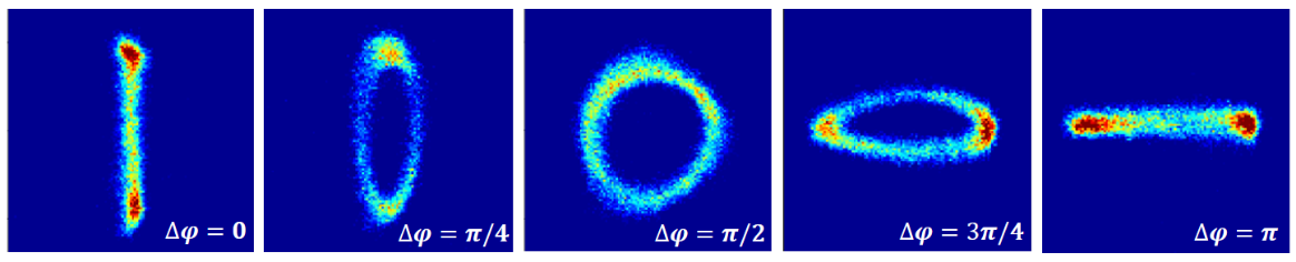 通过改变两束THz脉冲的延时,可对合成的THz偏振态进行操控,实现对3 MeV电子streaking图案从一维直线到二维椭圆和圆的切换,如下图所示。