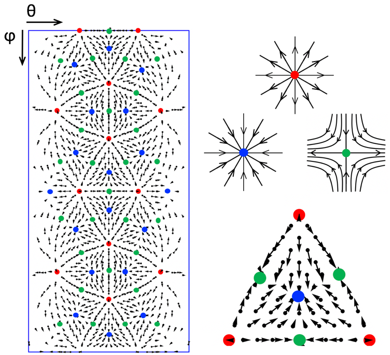 图1. 球面晶体中拓扑缺陷驱动的高度有序的速度矢量场。整个矢量场被12个拓扑缺陷(红点所示)分割成20个等同的基本单元。其间发现三种不同类型的奇点,分别用不同颜色点表示。红点亦表示球面晶体中天然存在的旋错(一种基本的拓扑点缺陷)。为展现系统全景,图中使用了球坐标系。