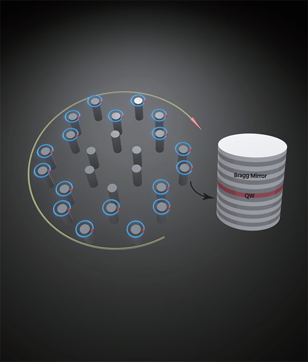 图一:基于半导体微腔阵列构成的光学拓扑绝缘体结构,边缘态绕着阵列的外围沿顺时针方向传输。由于系统的拓扑保护属性,逆时针方向传输的边缘态被禁止出现,因此,该边缘态的传输具有十分稳定的单向性。