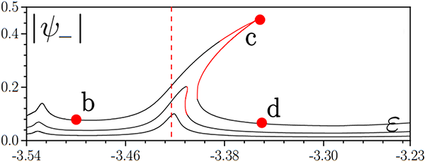 图二:光学双稳态。可以看到,随着输入参数(光的频率e)的变化,系统的模式输出显示了典型的磁滞回线的特征。图中黑线表示对应的状态是稳态,红线表示对应的状态是非稳态。因此,系统存在着双稳态——基于拓扑边缘态的双稳态!