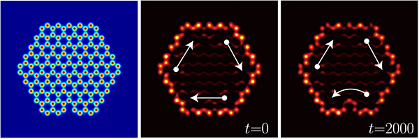 图三:拓扑保护的双稳态。为了模拟系统受到的强扰动,我们将微腔阵列外围的某个微腔拿掉(左),观察此时系统中边缘态的演化。可以看到,边缘态(中)在演化过程中巧妙地绕过了该缺陷,最终形成了一个新的稳定的边缘态(右图)。这个结果反映了承载双稳态操作的拓扑态的鲁棒性。