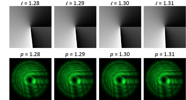 第一行:加载在SLM上的相位图,l为实际拓扑荷值;第二行:采集到的涡旋光,p为识别后的预测值。