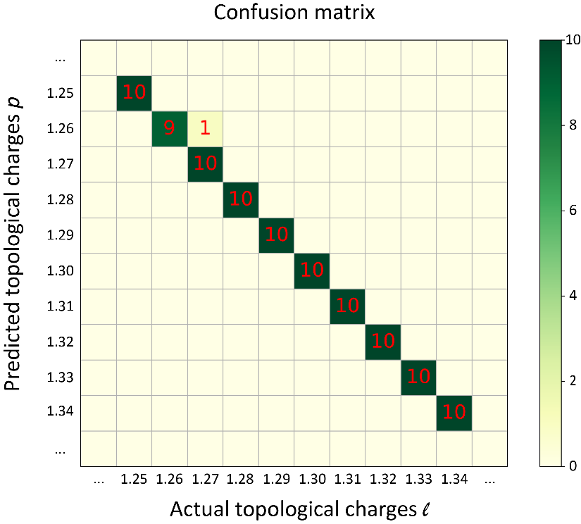 为此,陈险峰研究组提出开发具有超精细分数轨道角动量的涡旋光束来避免上述相位奇点以及衍射效应带来的限制。研究人员通过深度学习算法处理传统方法难以实现的分辨任务,突破性地精准识别出拓扑荷间隔为0.01的光学轨道角动量,如图1所示。实验上采集了拓扑荷从1.00到1.99这100种不同的涡旋光束,每个涡旋光都赋以100个不同的初始相位状态。经由设计的卷积神经网络训练后,该方法对测试集(不参与训练的涡旋光)的识别准确率达到了98%,测试集混淆矩阵如图2所示。由于测试集中的涡旋光束都是唯一的,因此该识别结果验证了此方法对于不同初相位的旋转鲁棒性,反映出其捕捉轨道角动量一般性特征的能力。同时,研究人员以0.01的拓扑荷间隔编码了超精细的8 bit光学轨道角动量叠加态,并以此为基础演示模拟了一种自由空间信息传输方案。图3中爱因斯坦画像的每个像素都可以由一个8 bit叠加态表示,每个叠加态都由拓扑荷从2.00到1.93的8个分数轨道角动量编码而成。实验中先对所有的叠加态进行采集训练,随后将画像分解为像素序列进行通信传输,最后在接受端进行识别还原。该实验过程中数据传输的比特错误率小于0.02%,展示出了高数据保真度;并且实验过程中的系统扰动并没对结果产生影响,体现了该方法的优越性。