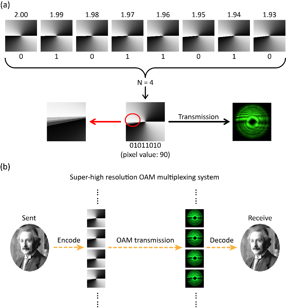 图3 在自由空间中使用8 bit超精细光学轨道角动量叠加态进行信息传输。