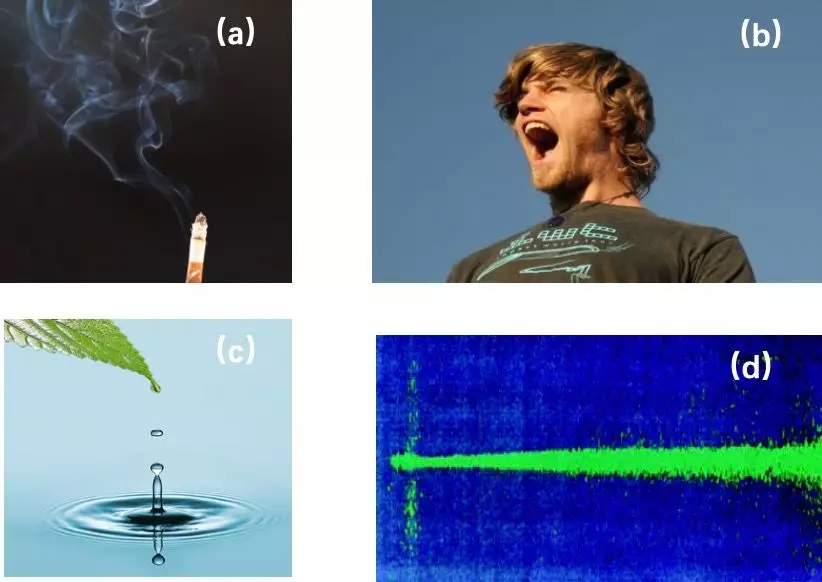 图一:无处不在的散开现象:跟烟雾会自然地散开一样(a),声音(b)、水波(c)、激光光束(d)都会散开。散开是各类波的普遍特性,因此,如何将波局域住是一个很重要的科学问题。