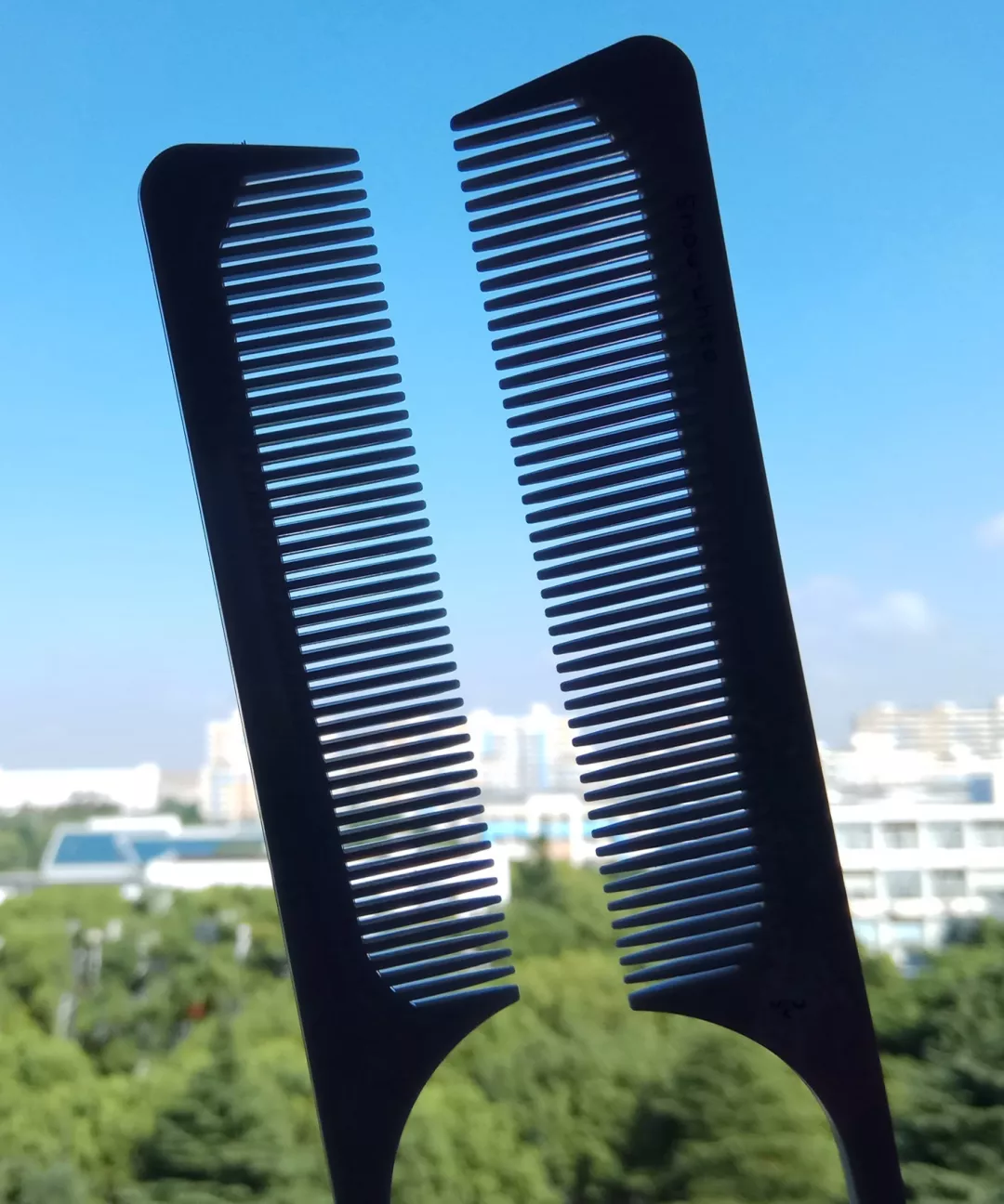 图二:拿起两把梳子(左图),将其重叠并相互转过一个小角度,便能看到明暗相间的条纹——莫尔条纹(右图)。