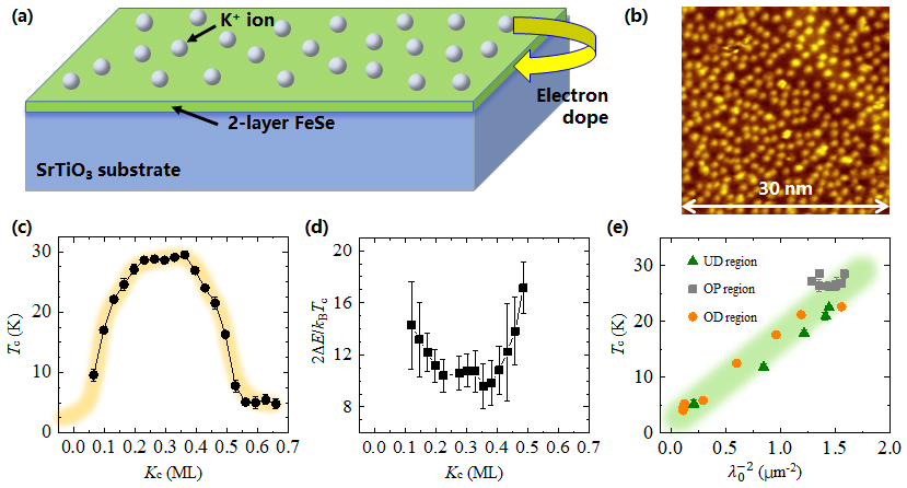 超导研究领域的两大动力,一个是找到转变温度(Tc)更高的超导材料,一个是理解非常规超导机理。事实上,两大类的非常规超导体,铜基和铁基超导体,都是层状材料,其超导层CuO、FeAs或者FeSe层,受到了邻近层的电荷掺杂之后才具有了高温超导特性。因而,近年来就有很多工作希望直接对这些超导层进行电荷掺杂和研究,这其中尤以对FeSe层的研究最具代表性。在合适的衬底上利用分子束外延法生长出单层或多层的FeSe薄膜是最近研究的热点。国内外有多个课题组的近期工作发现,在这样的FeSe薄膜表面,吸附上适量的K原子,可以改变FeSe薄膜的超导能隙的大小。这是因为K原子的电负性非常小,很容易转移一部分电子给FeSe薄膜(如图a所示),因此,控制K原子的吸附量,即是控制了FeSe薄膜所能获取的电子数量,从而有望达到对FeSe超导特性的调控。