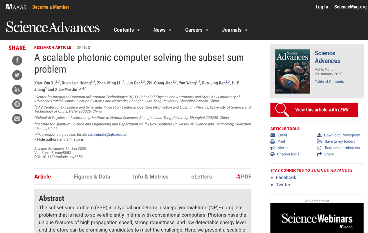 1月31日,上海交大金贤敏团队在最新一期美国《科学》杂志子刊Science Advances以“A Scalable Photonic Computer Solving the Subset Sum Problem”为题发表最新研究成果,提出了一种非冯诺依曼体系下的新型光子计算架构,展示了在求解具有NP-Complete计算复杂度的子集和问题(Subset Sum Problem)上超越经典电子计算机的潜力。这是一种结合了集成芯片、光子概念和非冯诺依曼计算架构的光子计算机,可以实现NP-Complete难解问题的高速直接运算,而且物理尺度具有可扩展性。该项研究提供了“量子霸权”之外超越经典电子计算机算力的新思路,光子计算机未来可期。