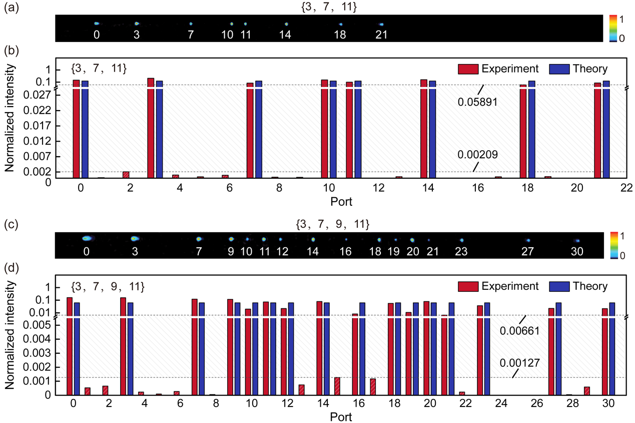 金贤敏研究团队成功地将SSP映射到由三种基本结构组成的三维集成光波导网络中,并借助飞秒激光直写技术刻写在光子芯片内部。当光子被注入光波导网络时,计算过程由此被激活。光子作为计算载体,类似于经典计算机中的电信号,在光波导网络中演化,并行搜索所有可能的演化路径来寻找解。不同的演化路径对应不同的元素组合,即子集。同时,光子的空间运动行为(水平或竖直)代表着元素是否被计入求和。所有路径对应的演化结果在光波导网络的输出端被同时读取,根据演化结果便可直接给出问题的解。