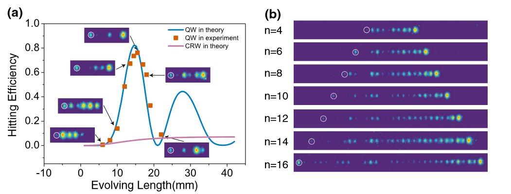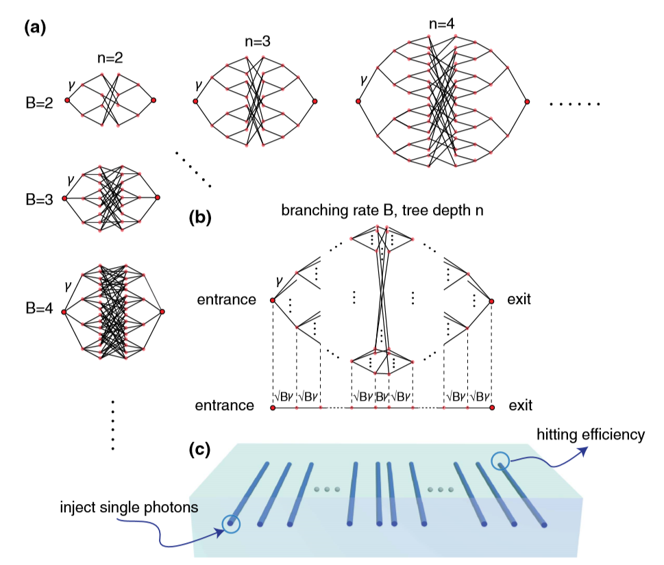 快速到达问题指图结构上粒子从起始节点(图1b中标明的Entrance)出发并快速到达目标节点(图1b中标明的Exit)的问题。对于经典随机行走,最优到达效率将随节点数增加快速下降;而量子行走运用量子物理的叠加性,能够对这种复杂粘合树结构实现明显提升的最优到达效率。此前该团队已基于三维光子集成芯片实现了六方粘合树结构的量子快速到达,作为量子快速到达的首个实验实现发表在Nature 子刊《自然-光子学》上。而六方粘合树结构只展示了平方级加速,对于如图1所示的标准的随机连接粘合二叉树结构,量子行走能够比经典随机行走实现指数级加速,这一特性对于构造量子加速算法应用具有重要意义。