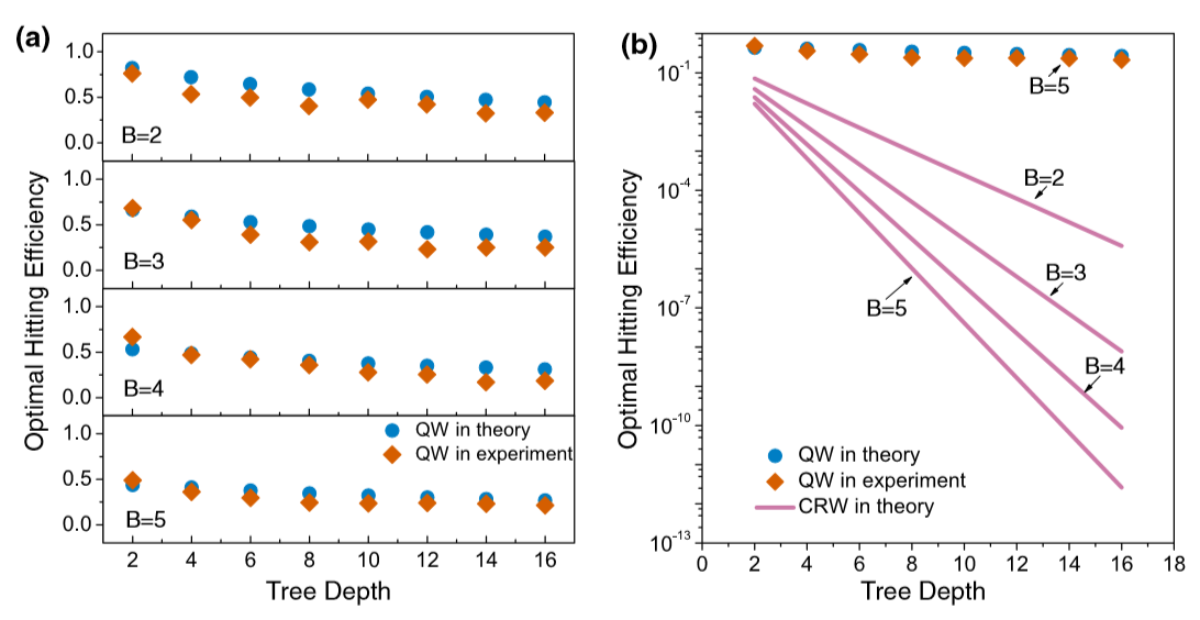 5月27日,上海交大金贤敏研究团队在最新一期国际光学权威期刊《Optica》上以“Quantum fast hitting on glued trees mapped on a photonic chip”为题发表最新成果,实验演示了粘合二叉树结构上的量子快速到达指数加速算法。Optica是美国光学学会(OSA)旗下影响因子最高的期刊(9.2)。研究团队利用粘合二叉树的一维等效结构,对层数从二层到十六层,叉数为二叉到五叉的粘合二叉树上的量子快速到达进行了实验演示,最优量子到达效率相对于经典随机行走可实现指数提升,从而展示了专用量子算法在快速到达问题上的指数加速优势。