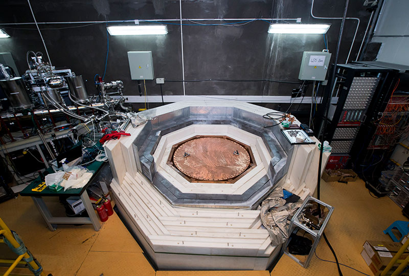 另一个中国直接探测暗物质实验CDEX合作组,由清华大学主导,成立于2009年,实验也在中国锦屏实验室开展。该实验着重探测低质量的WIMPs暗物质粒子(<10GeV/c2)。CDEX实验装置如图2所示,这里为外围屏蔽1米厚聚乙烯板房的内部情况,内层屏蔽体还包含铅墙,聚乙烯板和无氧铜板。中心探测器为P型点电极高纯锗探测器(PPCGe)。经过多年积累的公斤级锗探测器实验数据CDEX-1A 和CDEX-1B的实验结果很好地排除了国际实验CoGeNT和DAM-LIBRA的暗物质信号区域和年调制。而升级后的探测器CDEX-10(10KG锗探测器)在2018年发表了对于5GeV/c2暗物质粒子WIMP的反应截面限制8´10-42cm2,当时在该质量区国际领先。该合作组的未来长远计划是要发展吨级锗探测器和其关键技术,用于探测暗物质和无中微子双贝塔衰变。