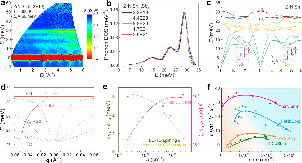 首先,结合非弹性中子散射实验和第一性原理计算(图1a-c),研究团队发现ZrNiSn体系中纵-横光学支劈裂(LO-TO splitting)会随着载流子浓度的增加而减小。这种现象说明化学掺杂效应会在材料中带来屏蔽效应,从而减弱其极化电场(图1d)。另外,该屏蔽效应的增强不仅增强了载流子迁移率,而且减弱了相应极化光学声子散射(图1e)。与此同时,载流子浓度的增加会强化声学声子散射和合金散射。两种效果的叠加致使half-Heusler热电材料中的迁移率表现出先增加后减小的非线性现象(图1f)。而这个交叉出现的拐点,正好对应着其热电性能的最优载流子浓度。