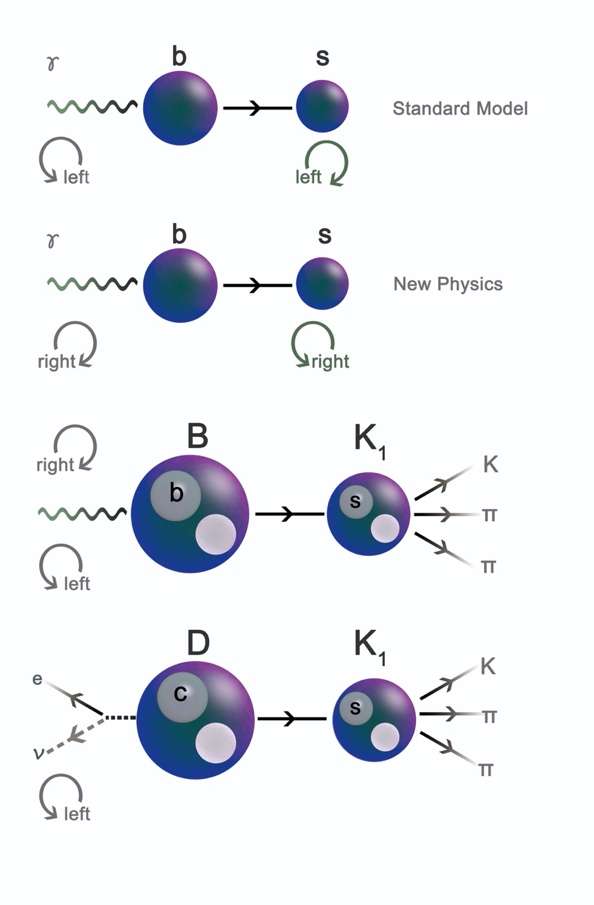 在夸克层次上,B → K1γ由味道改变中性流过程b → sγ诱导。由于味道改变中性流过程在粒子物理标准模型树图层次上是禁戒的,从而相应的衰变分支比非常小。更为重要的是,标准模型预言b → sγ过程的末态光子以左手为主,因此测量该衰变模式中的光子右手极化可用于检验标准模型以及探索新物理效应。人们已经注意到B → K1γ中的光子极化与由该过程定义的“上下不对称性”有关。但是由于“上下不对称性”依赖于K1介子强衰变过程,已有方法仅能借助于模型依赖或唯象方法分析强衰变衰变,具有非常大的模型相关性和误差。王伟课题组通过分析半轻过程半轻D衰变中,指出可以借助于中微子的螺旋度提取出K1强衰变的信息,从而最终确定B → K1γ过程的光子极化,为研究超出标准模型的新物理提供了一个理想物理量。
