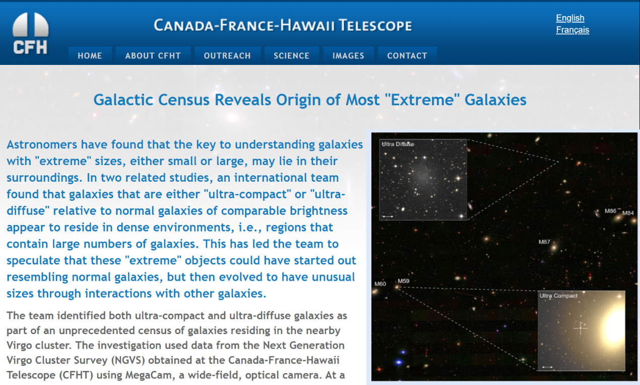 该研究成果在9月10日被加拿大-法国-夏威夷望远镜(以下简称CFHT)官方评为研究亮点,在其官网以“Galactic Census Reveals Origin of Most Extreme Galaxies”为题进行了报道[2]。并被加拿大国家研究院、美国AAS Press等机构在社交媒体上进行了推送。