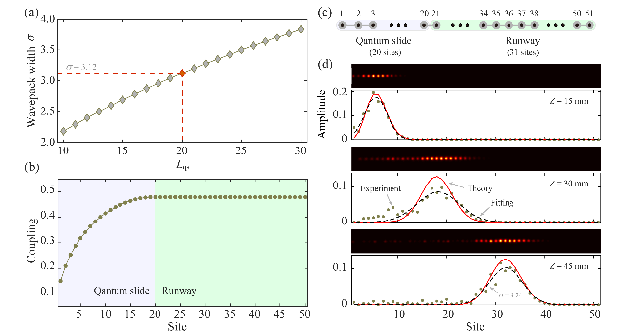研究团队通过精确地调控的一维链中相邻格点间的耦合强度,这样由一排波导组成的一维链就形成了量子滑梯:将光子注入在一维链的第一个格点,经过光子的演化,在一维链末端区域就可以获得一个完美的高斯波包。如上图所展示,波包的宽度可以通过一维链的长度调控,在量子滑梯后面接上一维均匀晶格,在均匀晶格中就可以获得高斯波包。