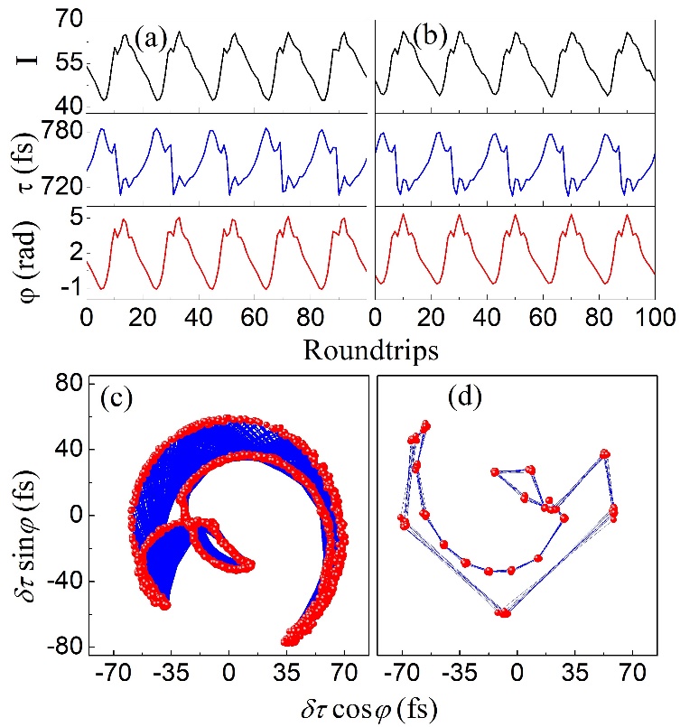 图1 (a)(b) 呼吸孤子的脉冲能量、相对时间、相对相位的演化。(c)(d) 相对时间和相对相位的关系。其中(a)(c)来自普通呼吸孤子,(b)(d)来自亚谐波呼吸孤子。