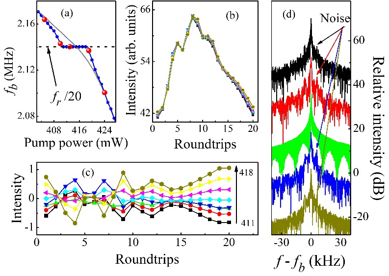 图2 (a)呼吸孤子的呼吸频率随泵浦功率的演化。(b)亚谐波呼吸孤子的呼吸轮廓。(c)不同孤子随泵浦功率增加的相对演化。(d)不同呼吸孤子的呼吸频率的频谱。