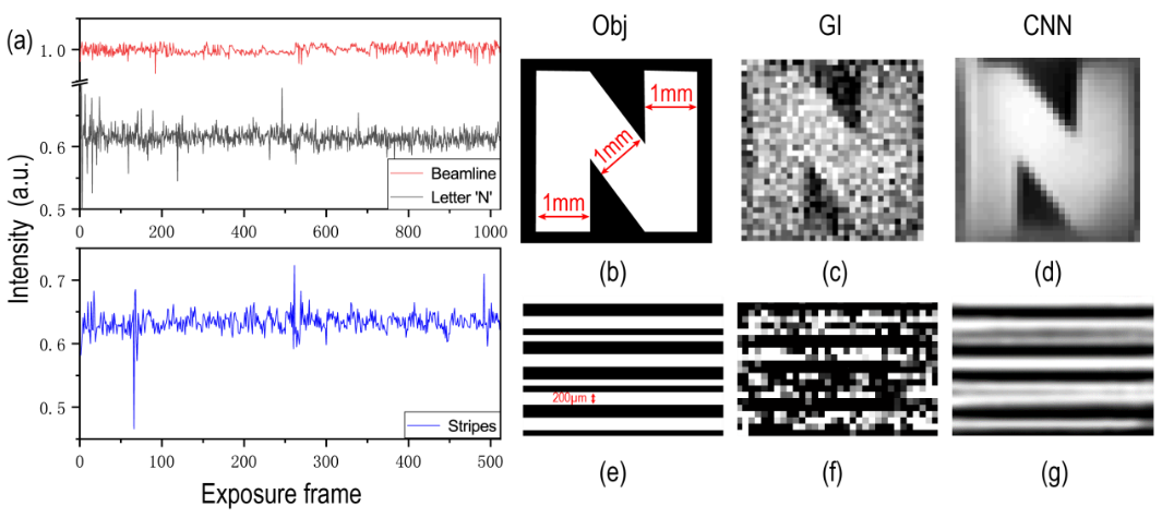 图二、归一化桶探测器信号和重建图像。(a) 桶探测器记录的每一帧中子束线强度;上图为束线波动,下面两个线分别为加了字母N和条纹的束线强度;(b) 物体N;(c)、(d) 常规GI和卷积神经网络(CNN)分别从1024次采样中获取的物体N和图像。(e) 条纹物体; (f)、(g) 常规GI和CNN分别从512次采样中获取的条纹图像。